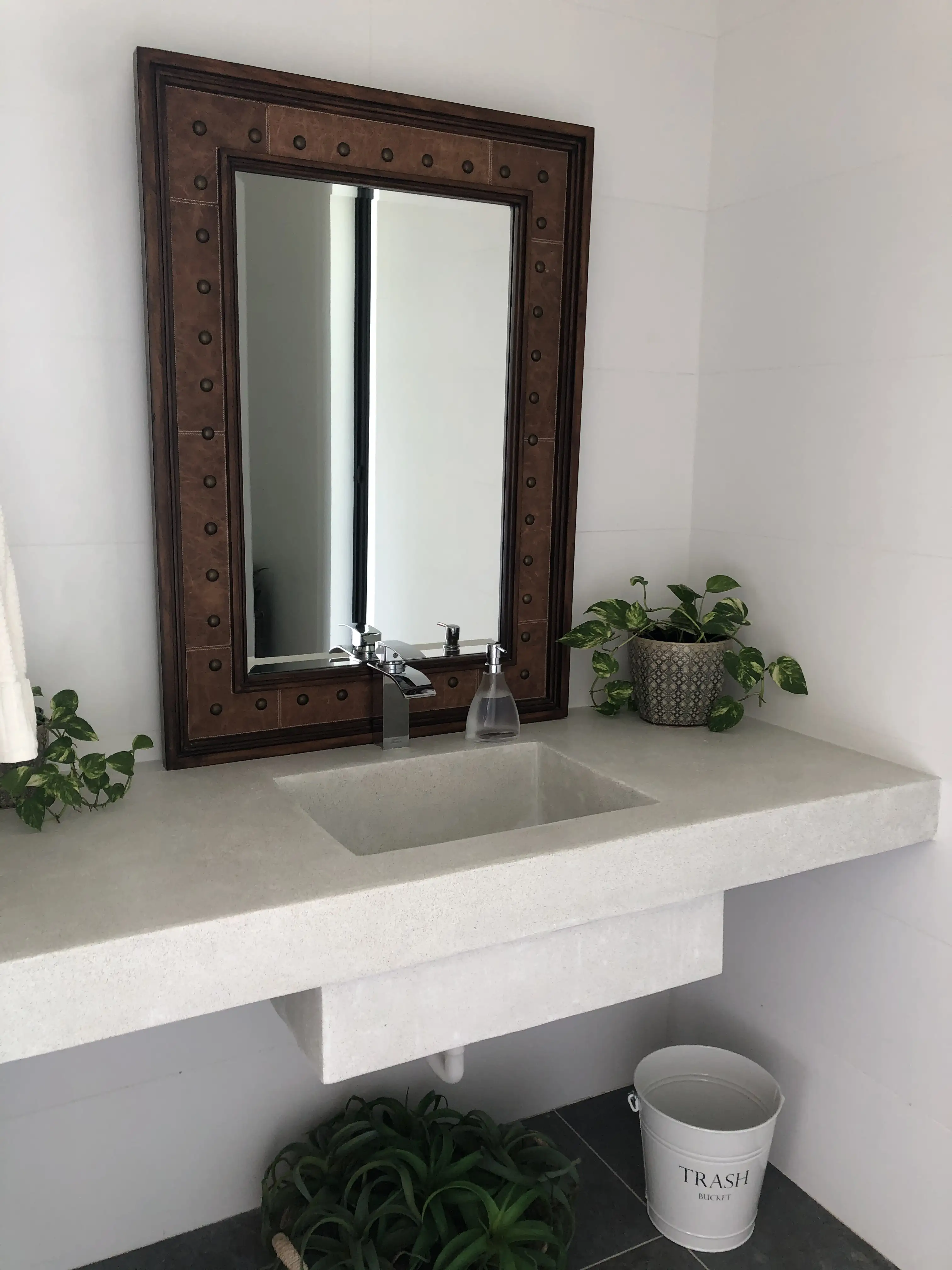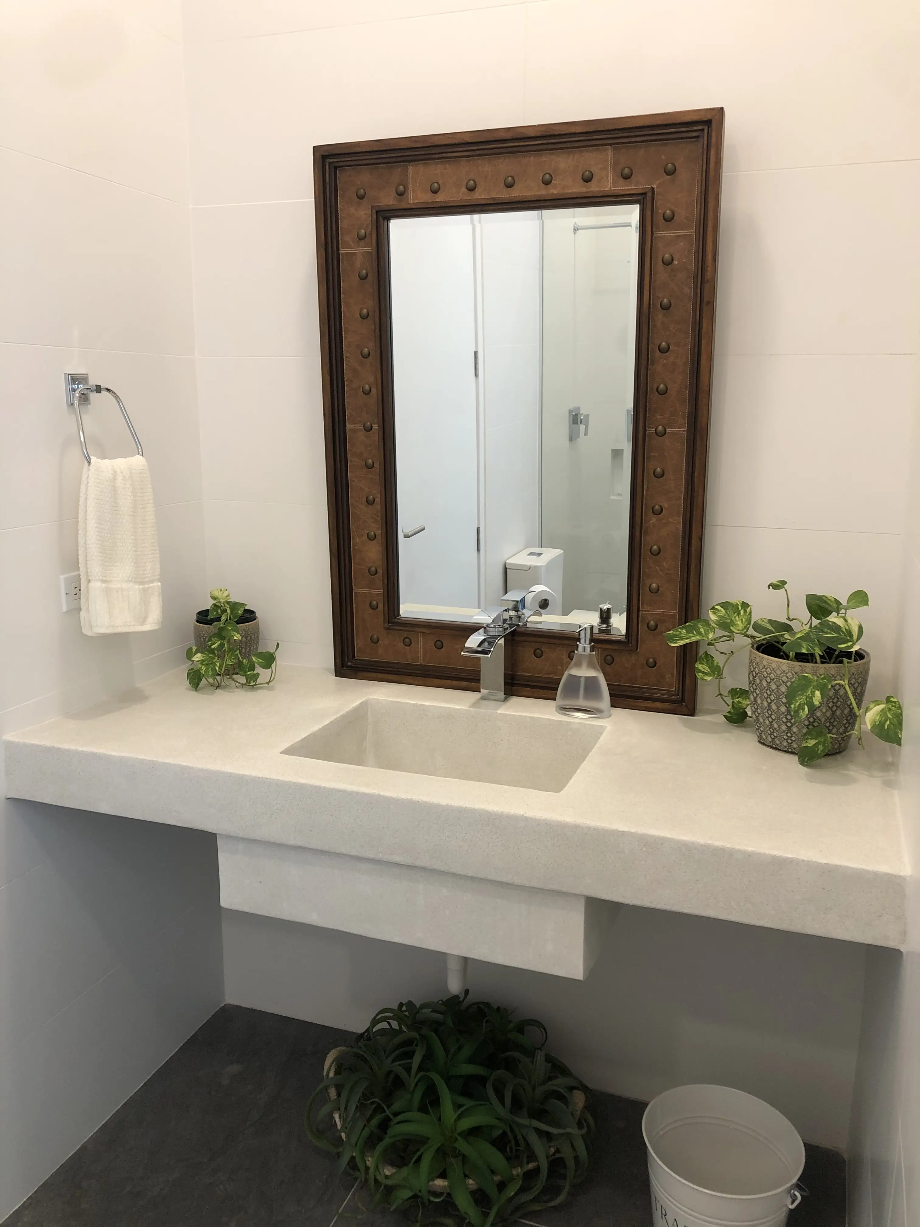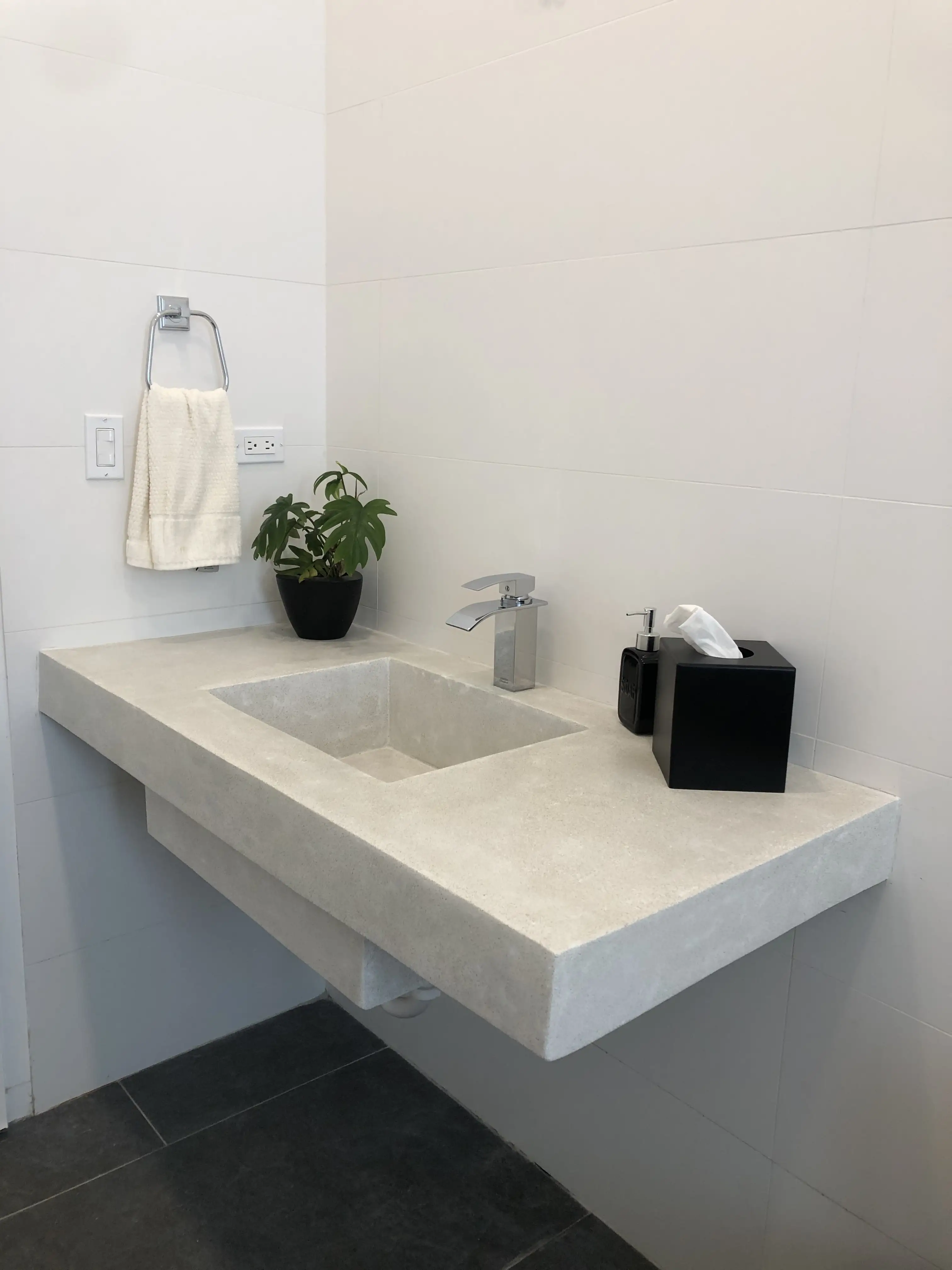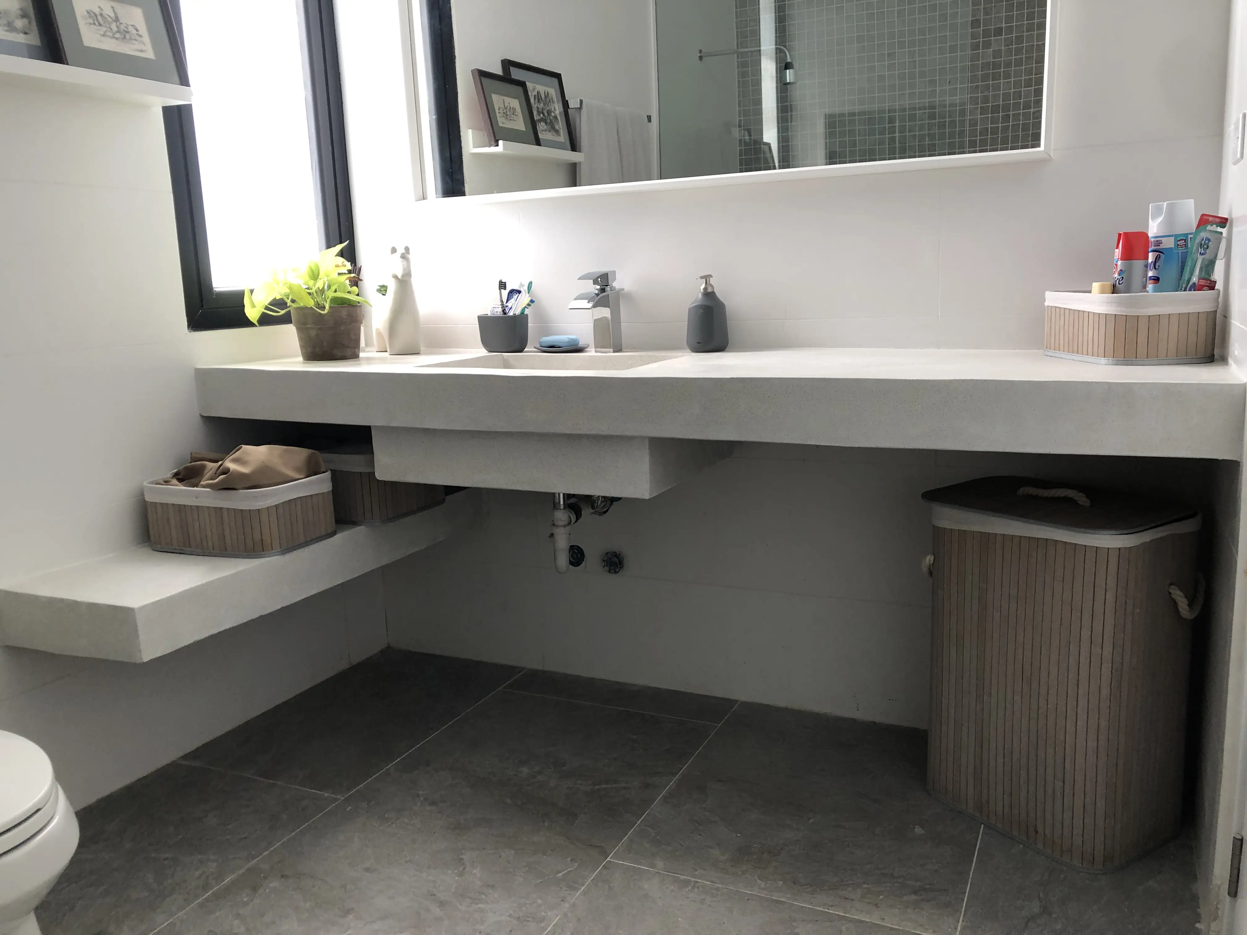 Fabricación de 2 baños con lavamanos, superficies integradas y acabados limpios de estilo moderno, ideales para espacios sofisticados y de fácil mantenimiento, combinando diseño minimalista y alta resistencia.