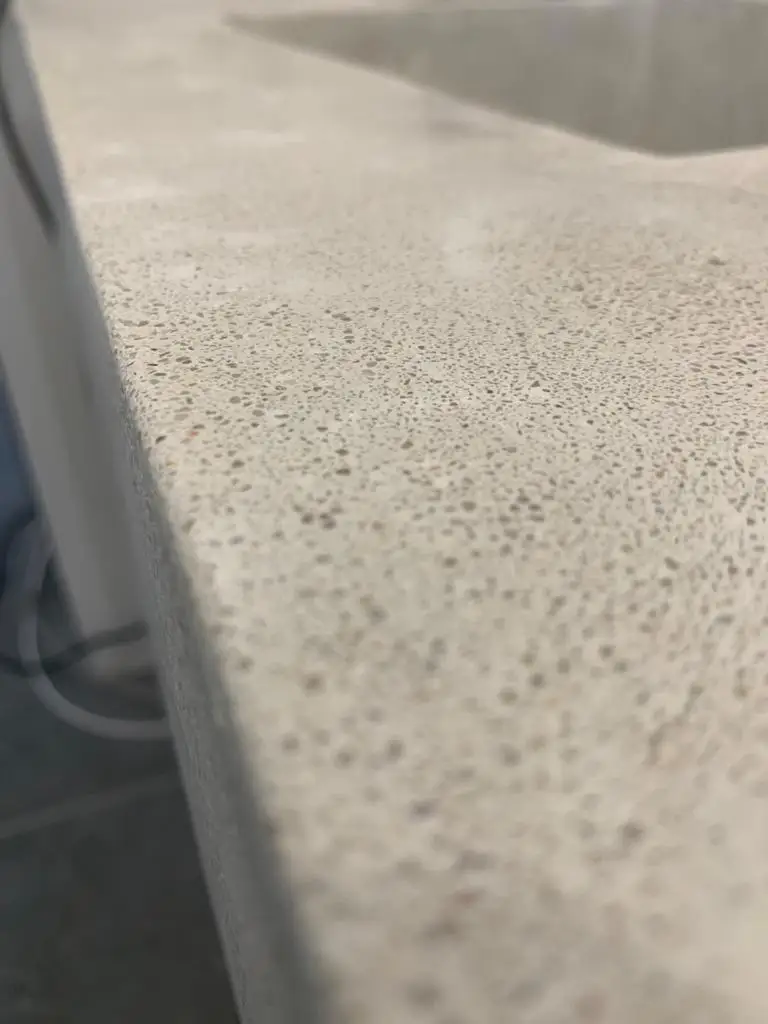 Acabado pulido con diamante de grano calibrado. Pigmento mineral en tono arena grisáceo de base neutra, con micro-puntos visibles de contraste sutil.